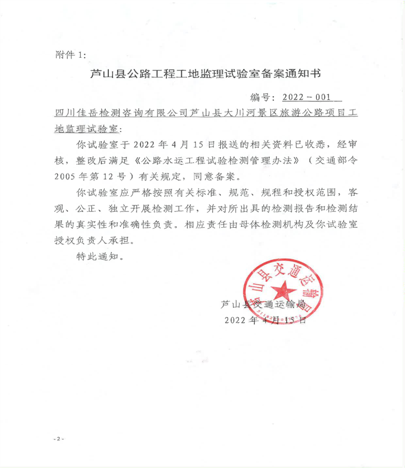 近日,交建集團(tuán)四川佳岳檢測咨詢有限公司蘆山縣大川河景區(qū)旅游公路項(xiàng)目監(jiān)理試驗(yàn)室,通過蘆山縣交通運(yùn)輸局備案驗(yàn)收,標(biāo)志著佳岳公司蘆山監(jiān)理試驗(yàn)室對蘆山縣大川河景區(qū)旅游公路項(xiàng)目可以獨(dú)立開展母體授權(quán)參數(shù)內(nèi)的檢測工作,出具相應(yīng)的檢測報告。