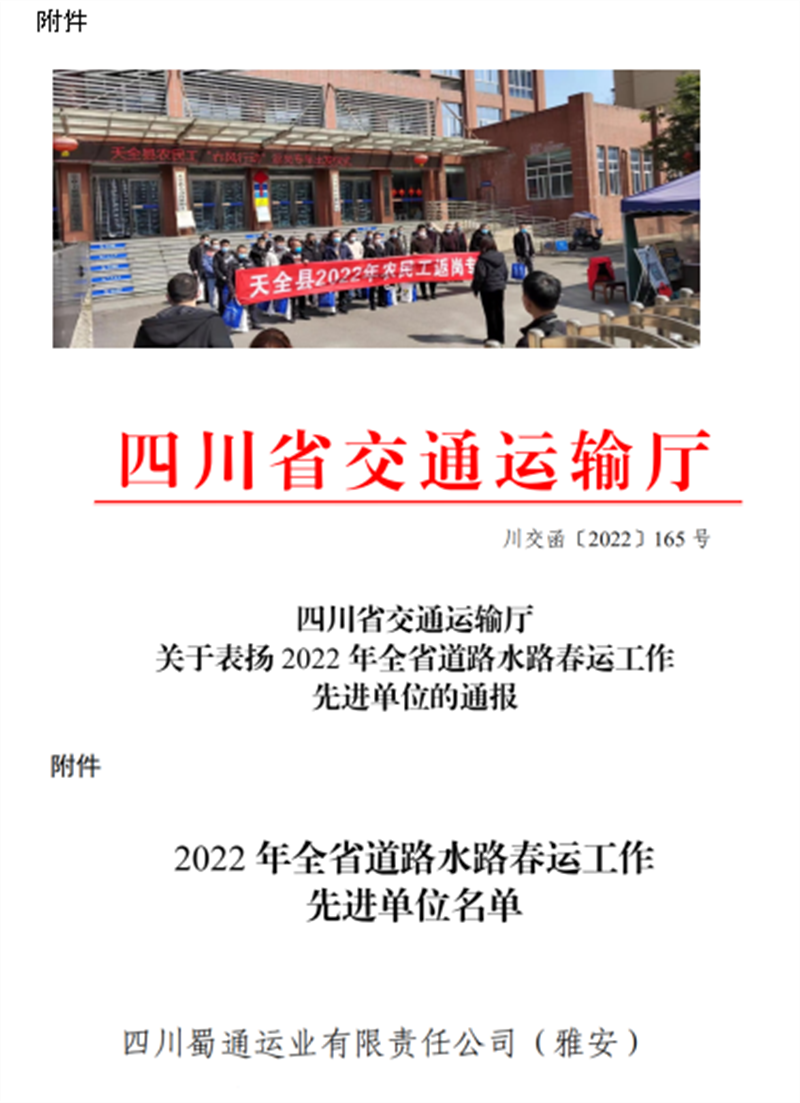 蜀通公司認(rèn)真落實各級政府和行業(yè)主管部門有關(guān)春運(yùn)工作的安排部署,堅持以“冬安行動”為抓手,全力以赴做好春運(yùn)期間運(yùn)輸安全和疫情防控,確保全市交通運(yùn)輸暢通、民生出行順利。2022年春運(yùn)期間,共投入班線車輛16546臺,發(fā)班21269班次,其中加班422班次,安全運(yùn)送旅客26余萬人次,圓滿完成2022年春運(yùn)工作,被四川省交通運(yùn)輸廳評為“2022年全省道路水路春運(yùn)工作先進(jìn)單位”。
