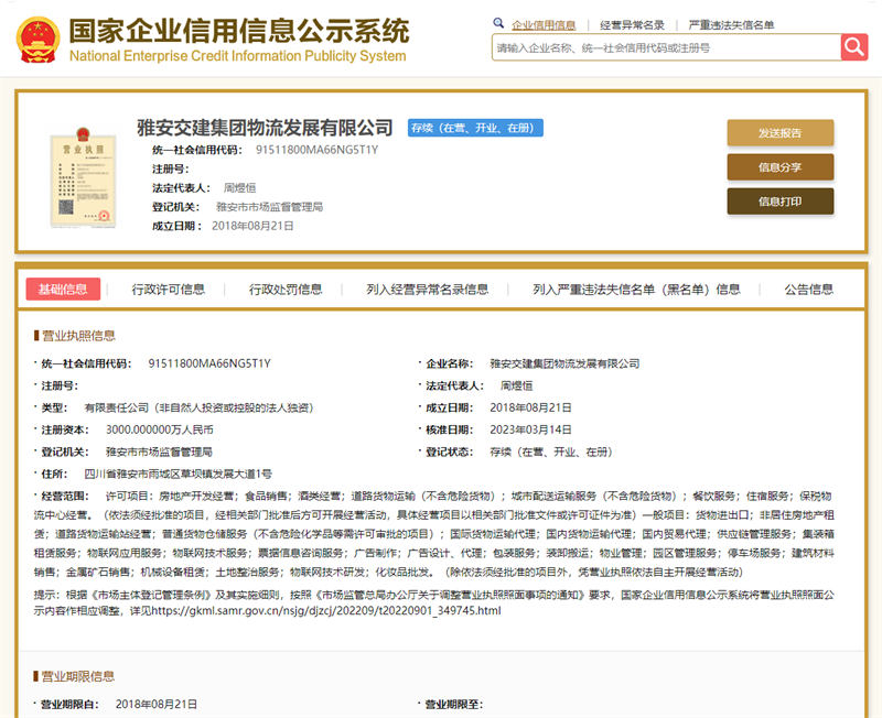 雅安交建集團(tuán)無(wú)水港物流有限責(zé)任公司完成工商變更登記工作