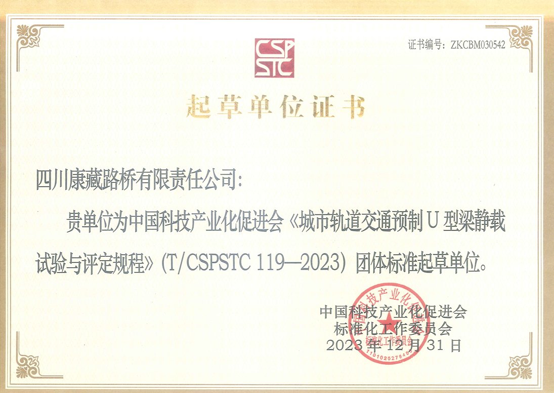 日前,雅安市交通建設(shè)(集團(tuán))有限責(zé)任公司收到中國(guó)科技產(chǎn)業(yè)化促進(jìn)會(huì)頒發(fā)的《城市軌道交通預(yù)制U型梁靜載試驗(yàn)與評(píng)定規(guī)程》(T/CSPSTC119-2023)團(tuán)體標(biāo)準(zhǔn)起草單位證書(shū),路橋公司參與起草的《城市軌道交通預(yù)制U型梁靜載試驗(yàn)與評(píng)定規(guī)程》團(tuán)體標(biāo)準(zhǔn),于2023年12月31日正式發(fā)布實(shí)施。