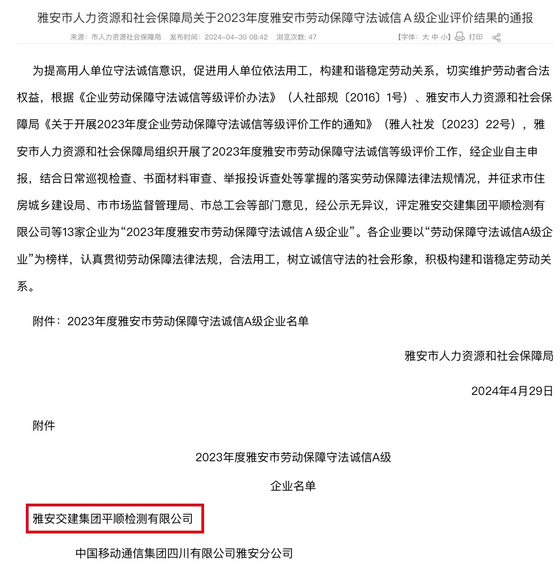 近日,雅安市人社局發(fā)布通報(bào),雅安交建集團(tuán)平順公司被評(píng)定為“2023年度雅安市勞動(dòng)保障守法誠(chéng)信A級(jí)企業(yè)”。此次評(píng)選由人社局結(jié)合日常巡視檢查、書面材料審查、舉報(bào)投訴查處以及專項(xiàng)檢查等活動(dòng)掌握的落實(shí)勞動(dòng)保障法律法規(guī)情況,并征求市場(chǎng)監(jiān)管局等部門和單位意見(jiàn)后,綜合評(píng)定而出。