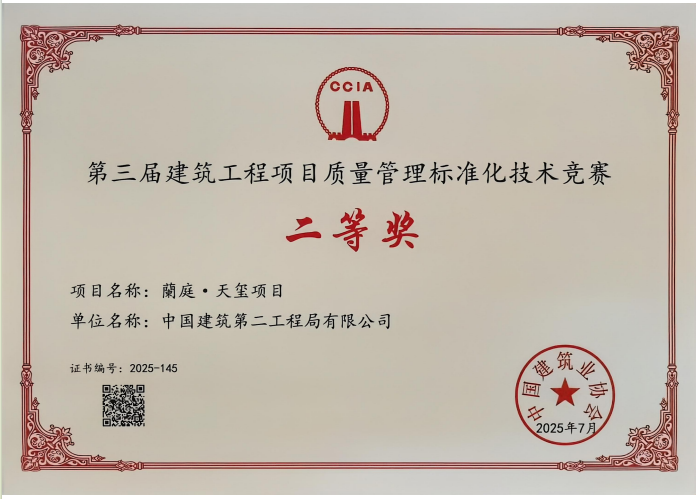 近日,交建開發(fā)公司旗下“蘭庭・天璽”項目在中國建筑業(yè)協(xié)會組織的“第三屆建筑工程項目質(zhì)量管理標準化技術(shù)競賽”中榮獲二等獎。此次獲獎,標志著“蘭庭・天璽”項目的質(zhì)量管理體系與工程實體質(zhì)量獲得了行業(yè)權(quán)威認可,為項目后續(xù)創(chuàng)建更高層次的品質(zhì)獎項積累了寶貴經(jīng)驗。
