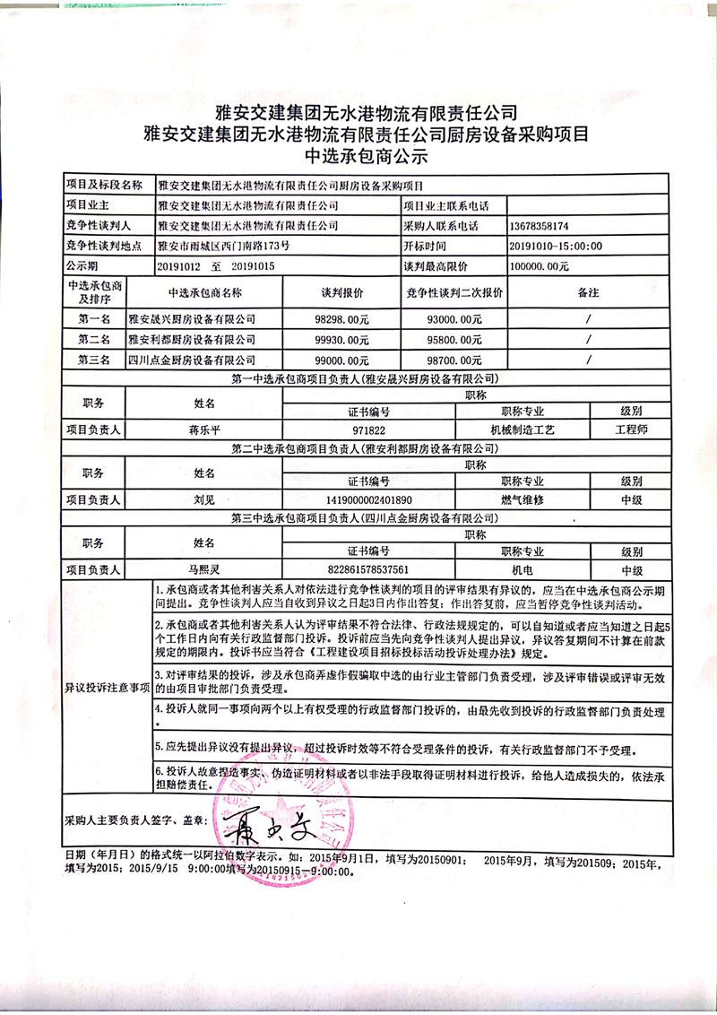 雅安交建集團(tuán)無水港物流有限責(zé)任公司廚房設(shè)備采購(gòu)項(xiàng)目中選承包商公示