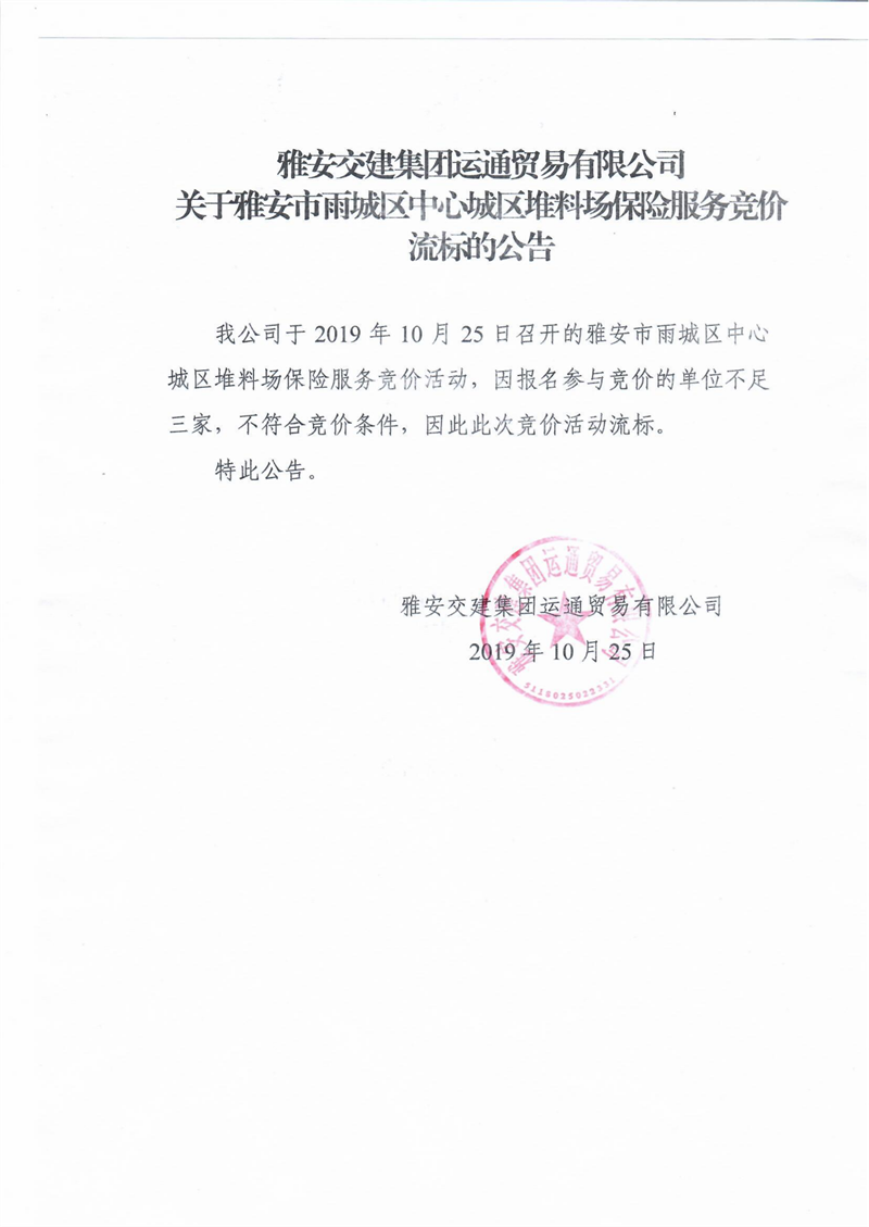 雅安交建集團(tuán)運通貿(mào)易有限公司關(guān)于雅安市雨城區(qū)中心城區(qū)堆料場保險服務(wù)競價流標(biāo)的公告