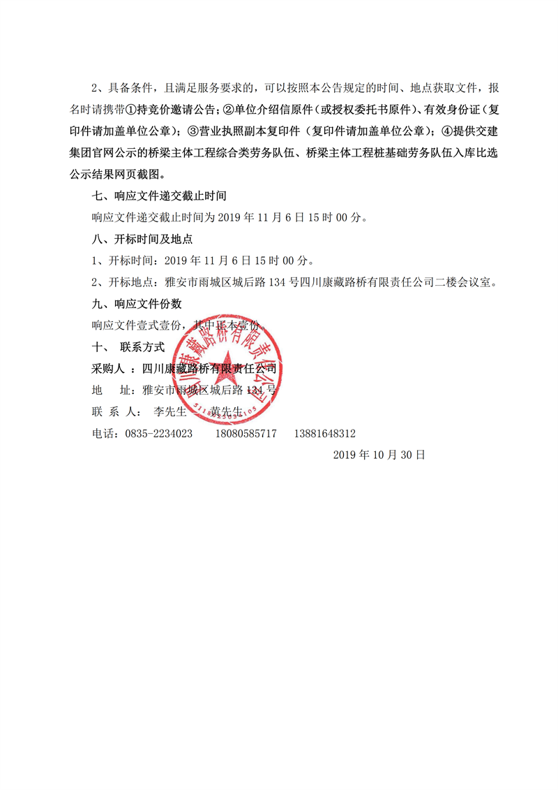 四川康藏路橋有限責(zé)任公司省道104線草壩至姚橋段改建工程項目橋梁樁基礎(chǔ)施工勞務(wù)競價公告
