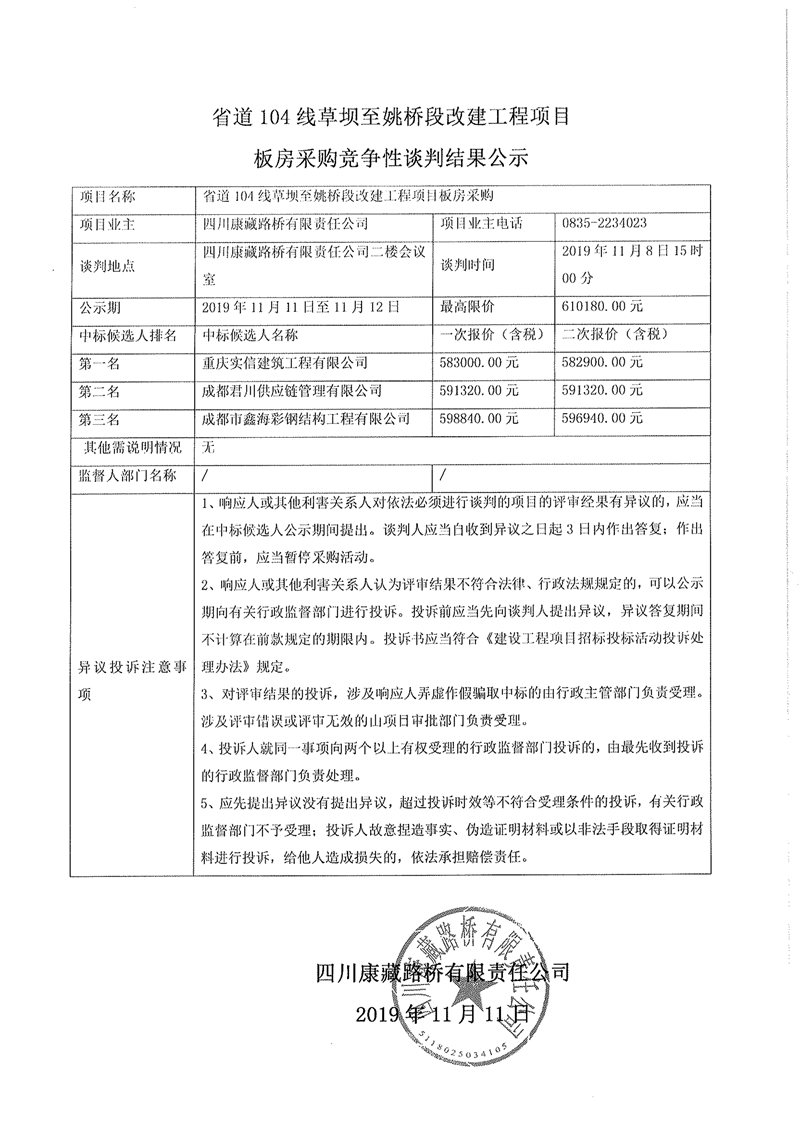 四川康藏路橋有限責(zé)任公司省道104線草壩至姚橋段改建工程項(xiàng)目板房采購競爭性談判結(jié)果公示
