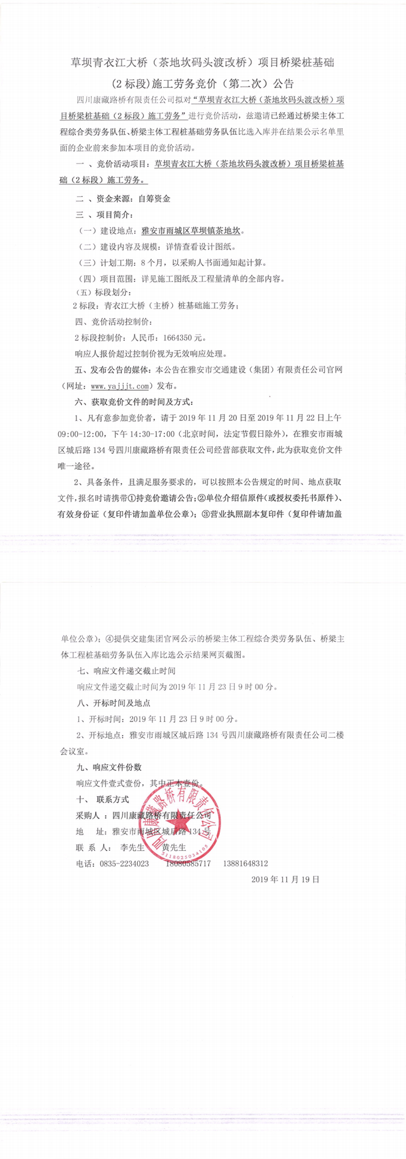四川康藏路橋有限責(zé)任公司草壩青衣江大橋(茶地坎碼頭渡改橋)項(xiàng)目橋梁樁基礎(chǔ)(2標(biāo)段)施工勞務(wù)競(jìng)價(jià)(第二次)公告