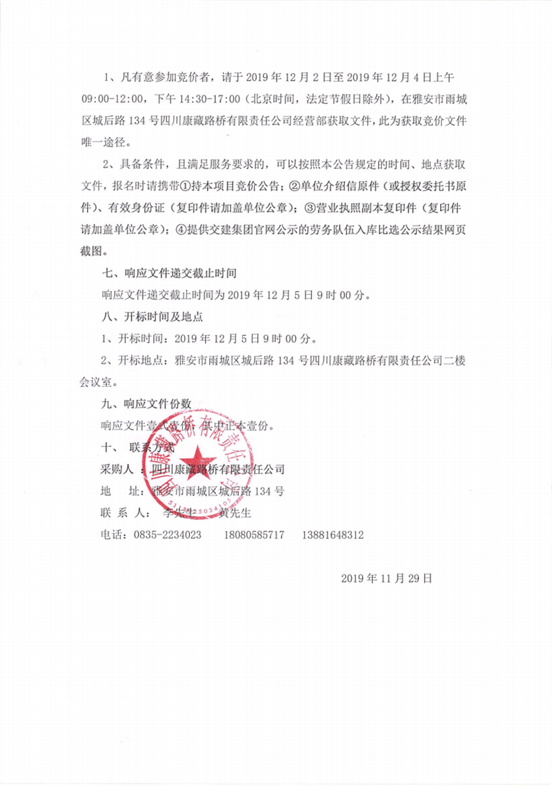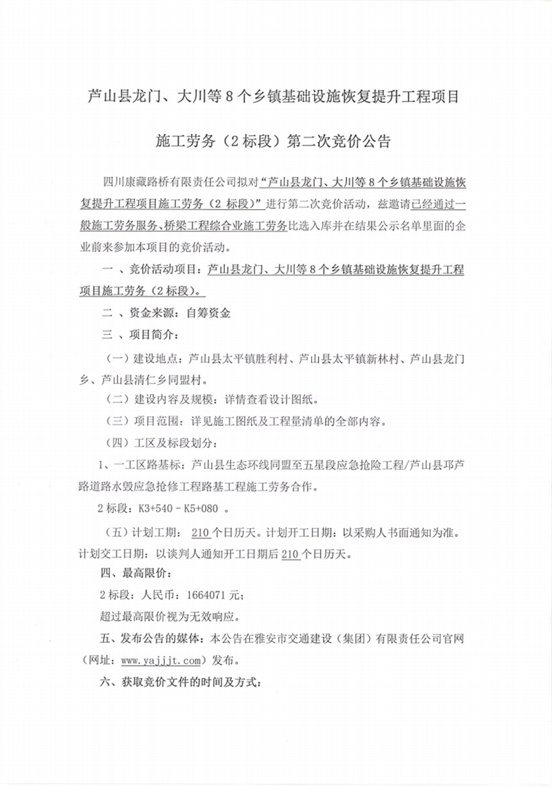 四川康藏路橋有限責任公司蘆山縣龍門、大川等8個鄉(xiāng)鎮(zhèn)基礎(chǔ)設(shè)施恢復提升工程項目施工勞務(2標段)第二次競價公告