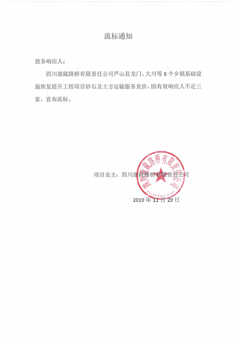 四川康藏路橋有限責(zé)任公司蘆山縣龍門、大川等8個(gè)鄉(xiāng)鎮(zhèn)基礎(chǔ)設(shè)施恢復(fù)提升工程項(xiàng)目砂石及土方運(yùn)輸服務(wù)競(jìng)價(jià)流標(biāo)通知