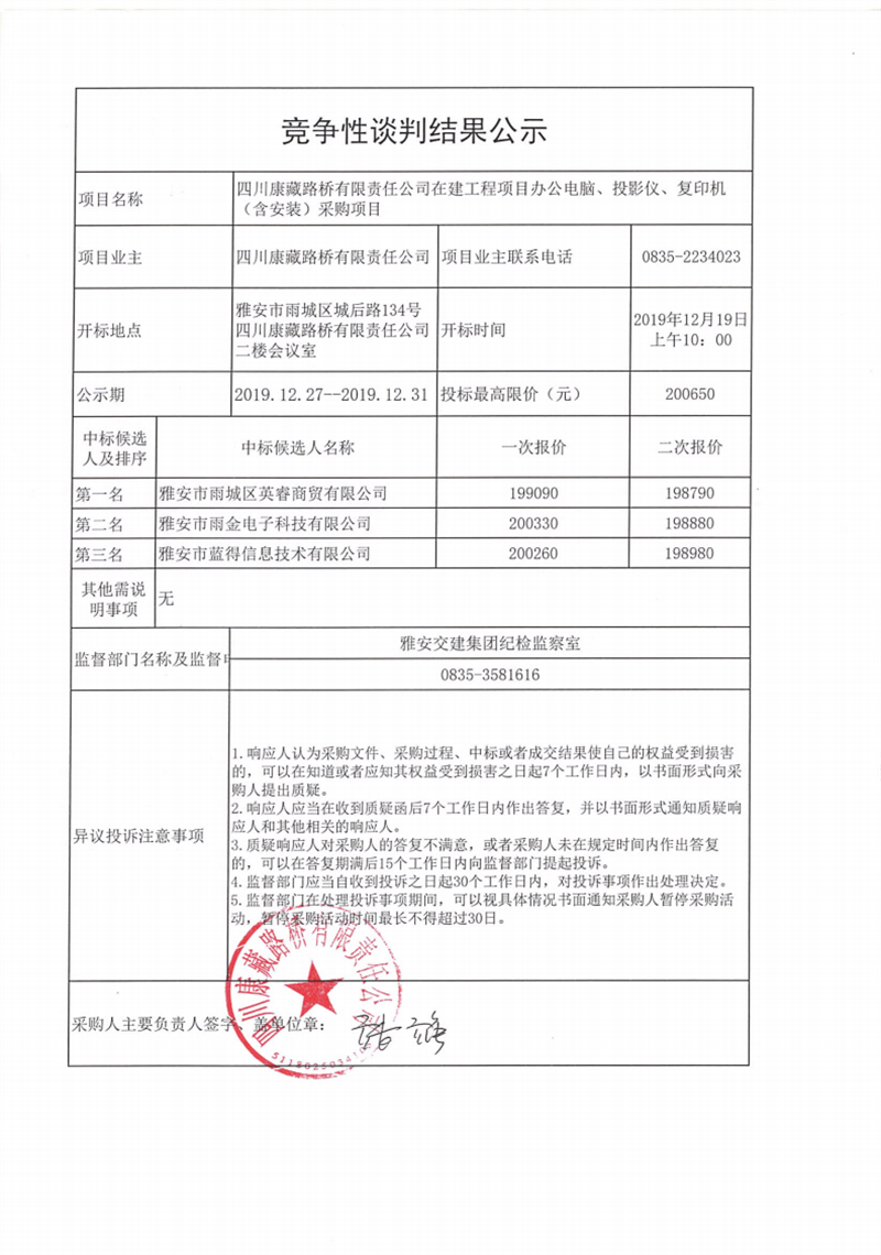 四川康藏路橋有限責任公司在建工程項目辦公電腦、投影儀、復印機(含安裝)采購項目競爭性談判結(jié)果公示