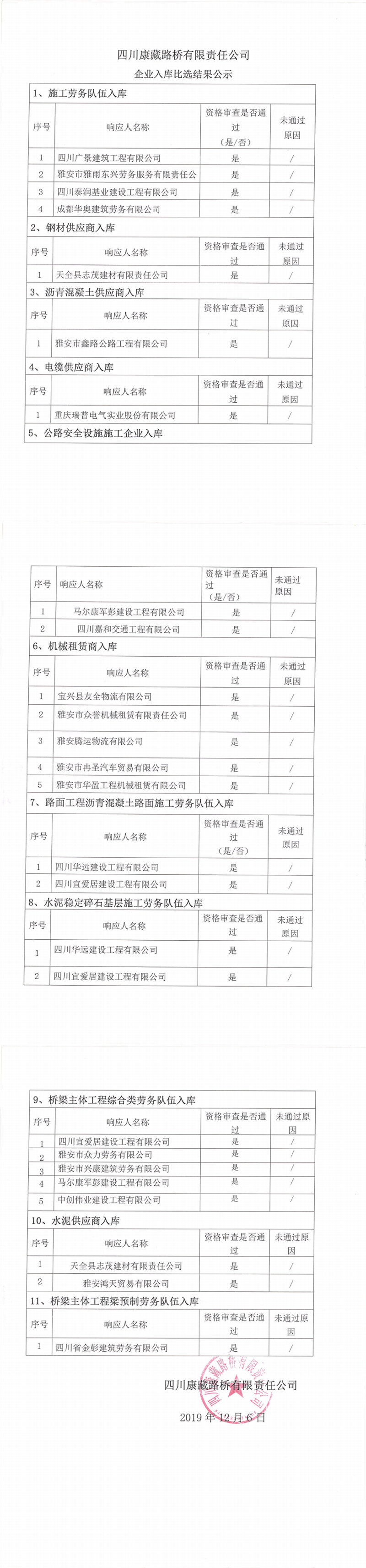 四川康藏路橋有限責任公司企業(yè)入庫比選結(jié)果公示