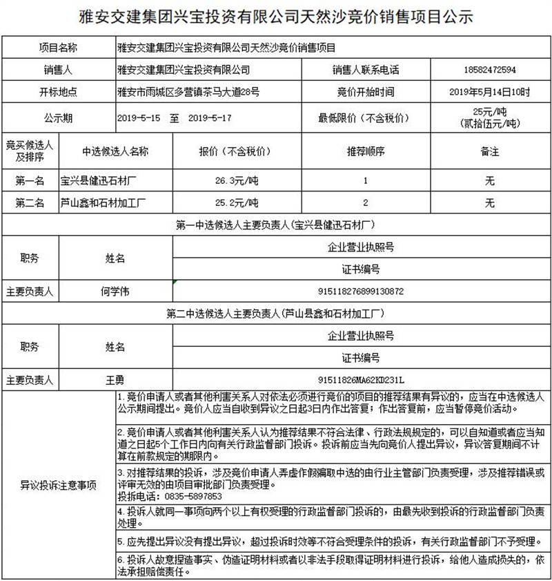 雅安交建集團(tuán)興寶投資有限公司天然沙競價(jià)銷售項(xiàng)目公示