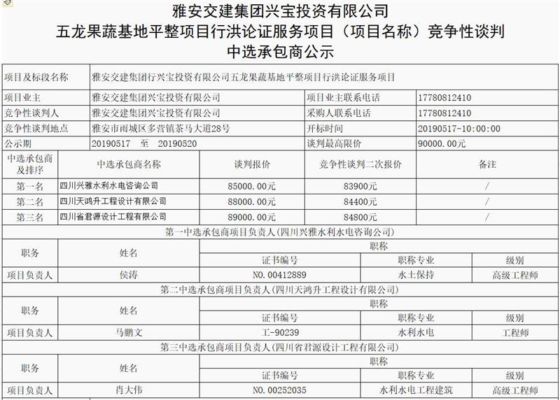 雅安交建集團(tuán)興寶投資有限公司五龍果蔬基地平整項(xiàng)目行洪論證服務(wù)項(xiàng)目(項(xiàng)目名稱)競爭性談判 中選承包商公示