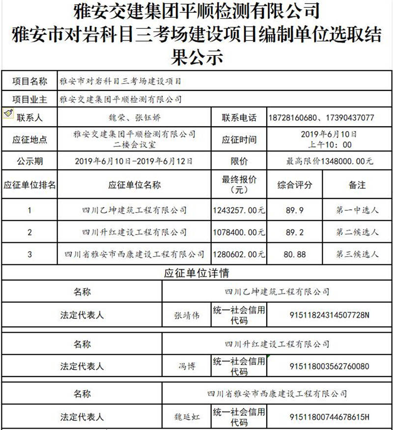 雅安交建集團(tuán)平順檢測有限公司雅安市對巖科目三考場建設(shè)項目編制單位選取結(jié)果公示