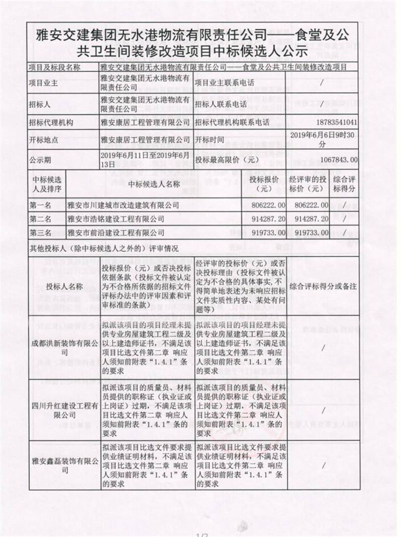 雅安交建集團(tuán)無(wú)水港物流有限公司食堂及公共衛(wèi)生間裝修改造項(xiàng)目中標(biāo)候選人公示