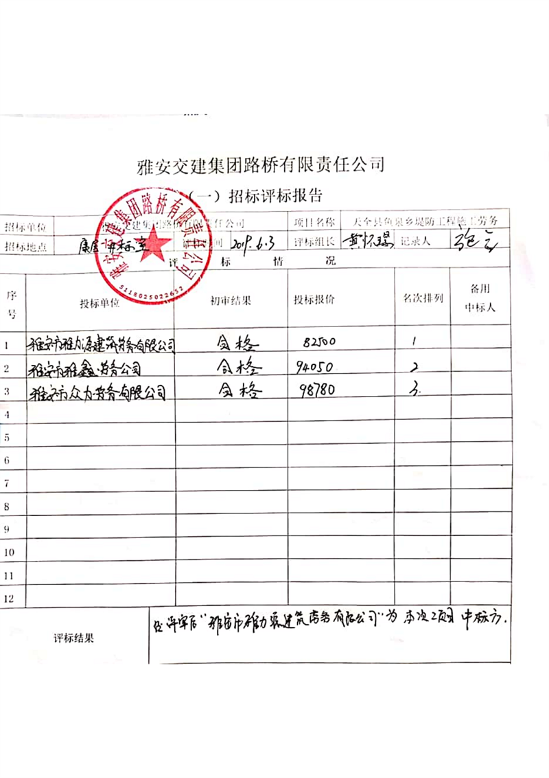 雅安交建集團(tuán)路橋有限責(zé)任公司天全縣魚泉鄉(xiāng)堤防工程施工勞務(wù)項(xiàng)目邀請招標(biāo)結(jié)果公示