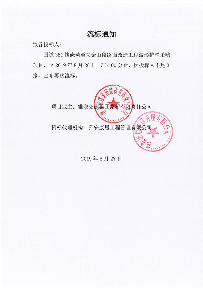 雅安交建集團(tuán)路橋有限責(zé)任公司國(guó)道351線蹺磧至夾金山段路面改造工程波形護(hù)欄采購(gòu)項(xiàng)目流標(biāo)通知