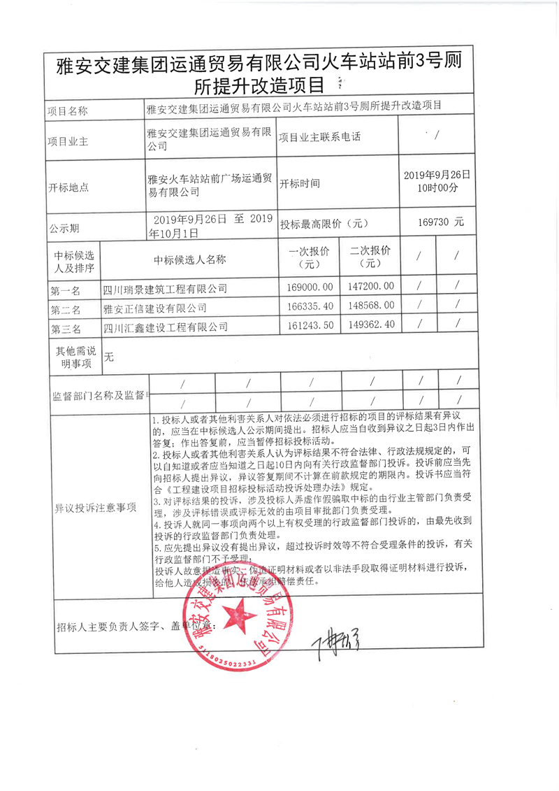 雅安交建集團運通貿(mào)易有限公司火車站站前廣場3號廁所改造提升項目(第二次)競爭性談判結(jié)果公示