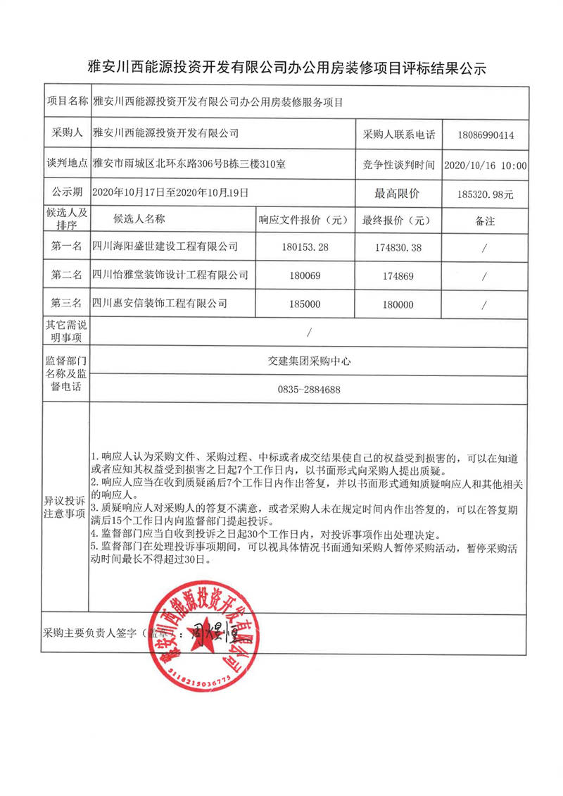 雅安川西能源投資開發(fā)有限公司辦公用房裝修項(xiàng)目評標(biāo)結(jié)果公示