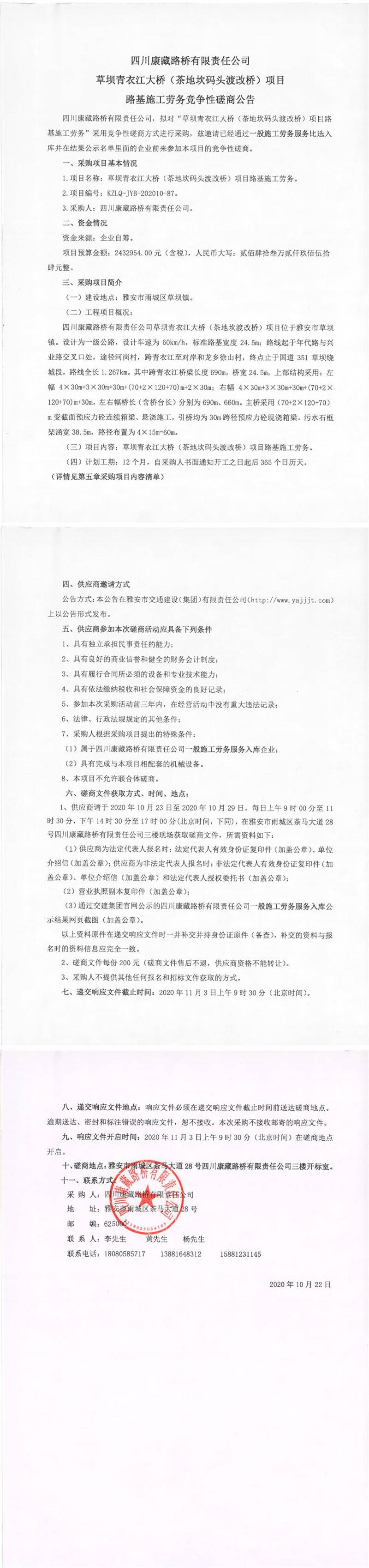 四川康藏路橋有限責(zé)任公司草壩青衣江大橋(茶地坎碼頭渡改橋)項(xiàng)目路基施工勞務(wù)競爭性磋商公告