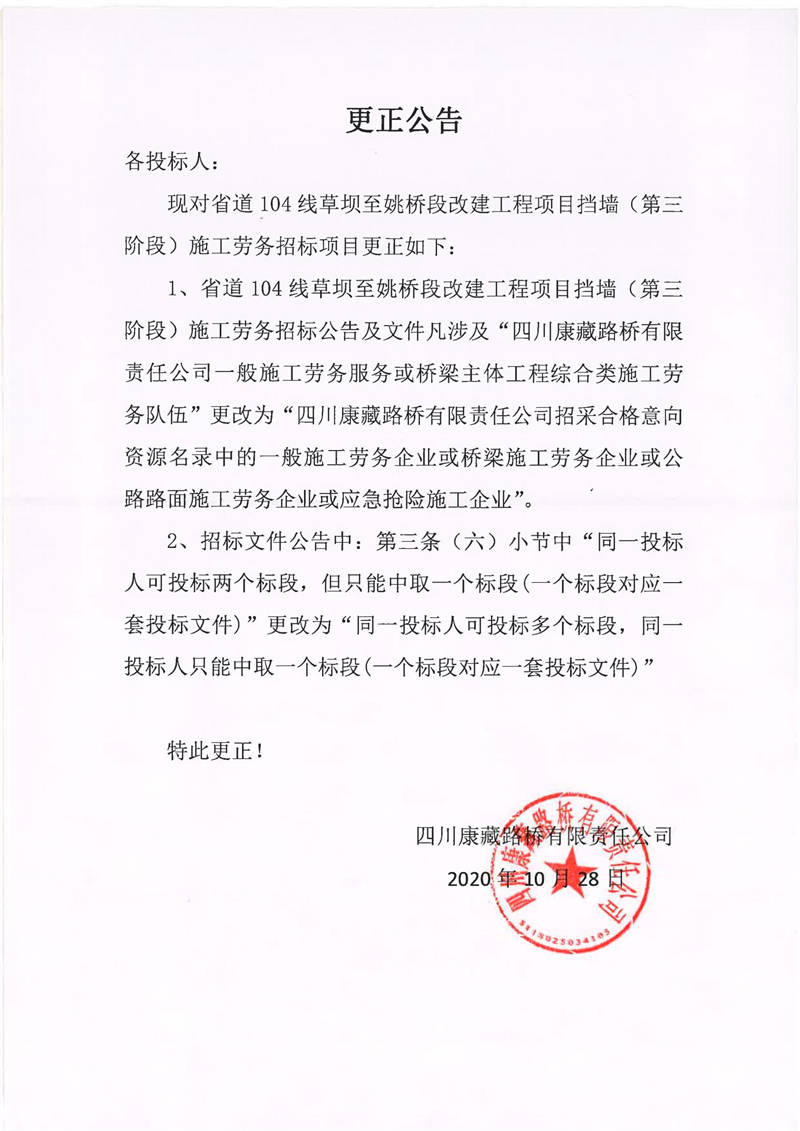 四川康藏路橋有限責任公司省道104線草壩至姚橋段改建工程項目擋墻(第三階段)施工勞務招標項目更正公告