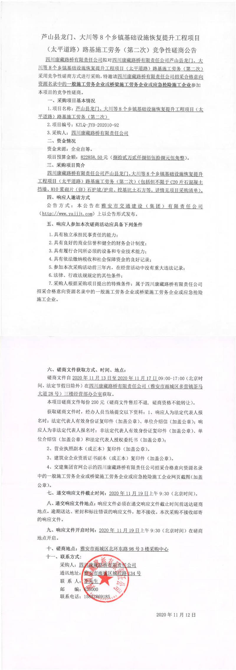 四川康藏路橋有限責(zé)任公司蘆山縣龍門(mén)、大川等8個(gè)鄉(xiāng)鎮(zhèn)基礎(chǔ)設(shè)施恢復(fù)提升工程項(xiàng)目(太平道路)路基施工勞務(wù)(第二次)競(jìng)爭(zhēng)性磋商公告