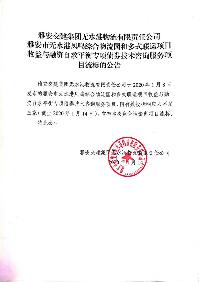 雅安交建集團(tuán)無(wú)水港物流有限責(zé)任公司雅安市無(wú)水港鳳鳴綜合物流園和多式聯(lián)運(yùn)項(xiàng)目收益與融資自求平衡專(zhuān)項(xiàng)債券技術(shù)咨詢(xún)服務(wù)項(xiàng)目流標(biāo)的公告