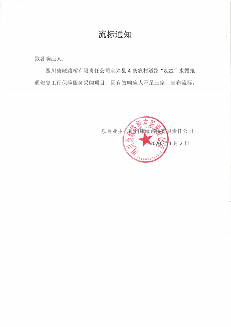 四川康藏路橋有限責(zé)任公司寶興縣4條農(nóng)村道路“8.22”水毀搶通修復(fù)工程保險(xiǎn)服務(wù)采購項(xiàng)目流標(biāo)通知