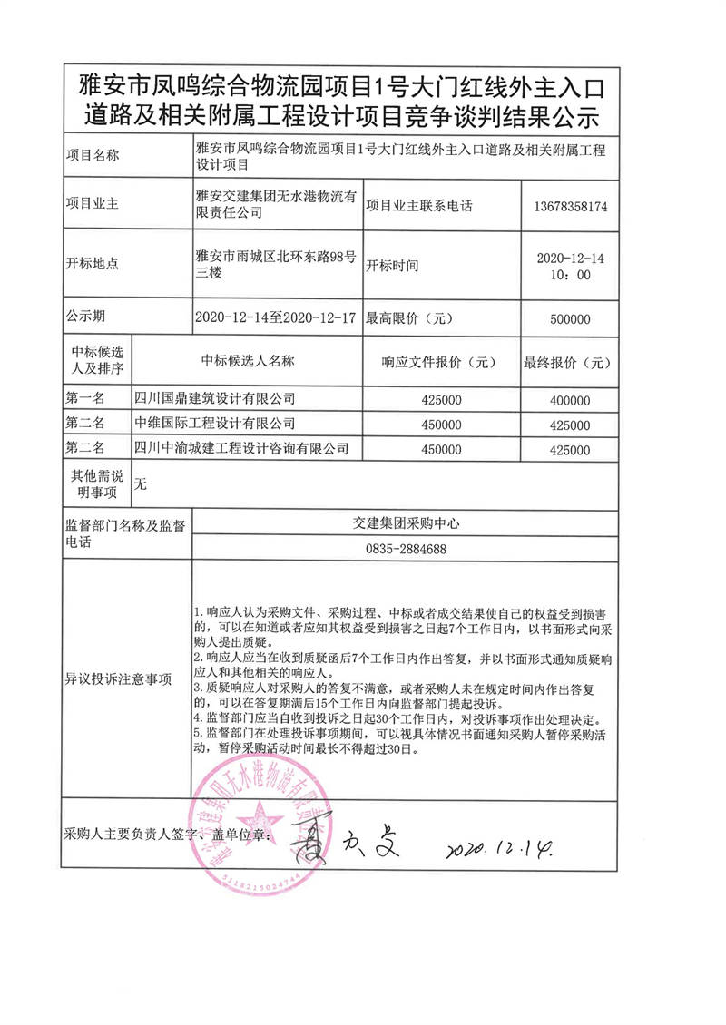 雅安交建集團(tuán)無水港物流有限責(zé)任公司雅安市鳳鳴綜合物流園項目1號大門紅線外主入口道路及相關(guān)附屬工程設(shè)計項目談判結(jié)果公示