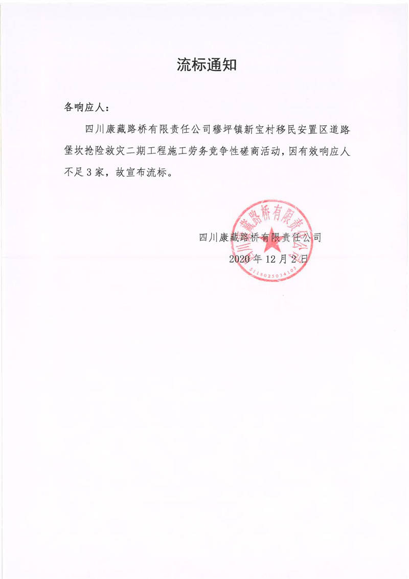四川康藏路橋有限責任公司穆坪鎮(zhèn)新寶村移民安置區(qū)道路堡坎搶險救災(zāi)二期工程施工勞務(wù)流標通知