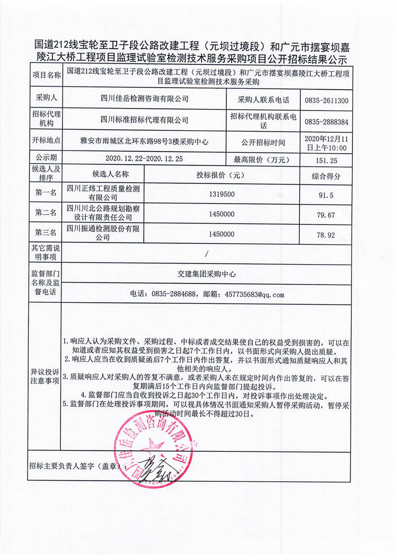 四川佳岳檢測(cè)咨詢有限公司國(guó)道212線寶輪至衛(wèi)子段公路改建工程(元壩過(guò)境段)和廣元市擺宴壩嘉陵江大橋工程項(xiàng)目監(jiān)理試驗(yàn)室檢測(cè)技術(shù)服務(wù)采購(gòu)項(xiàng)目公開(kāi)招標(biāo)結(jié)果公示