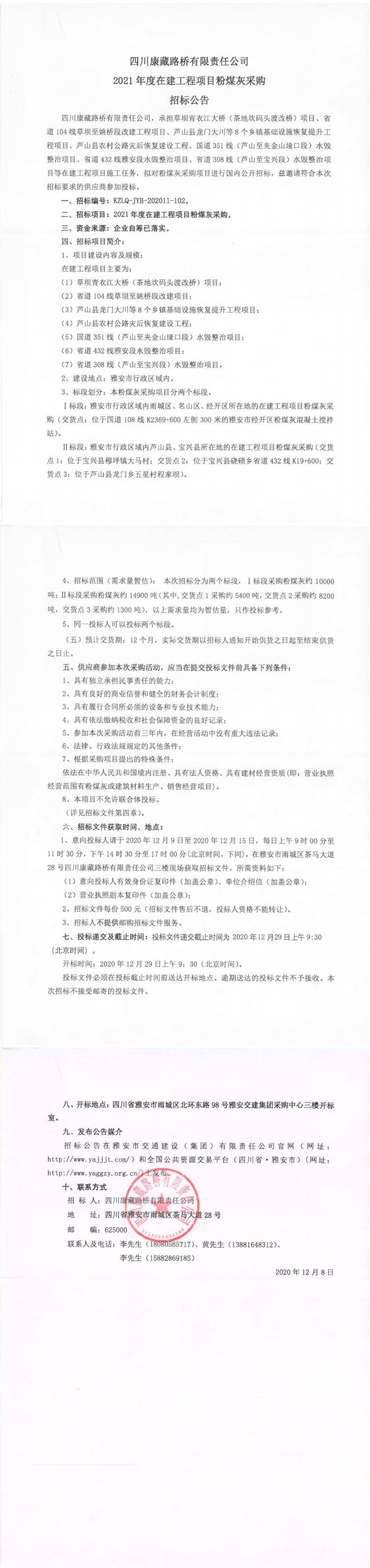 四川康藏路橋有限責任公司2021年度在建工程項目粉煤灰采購招標公告