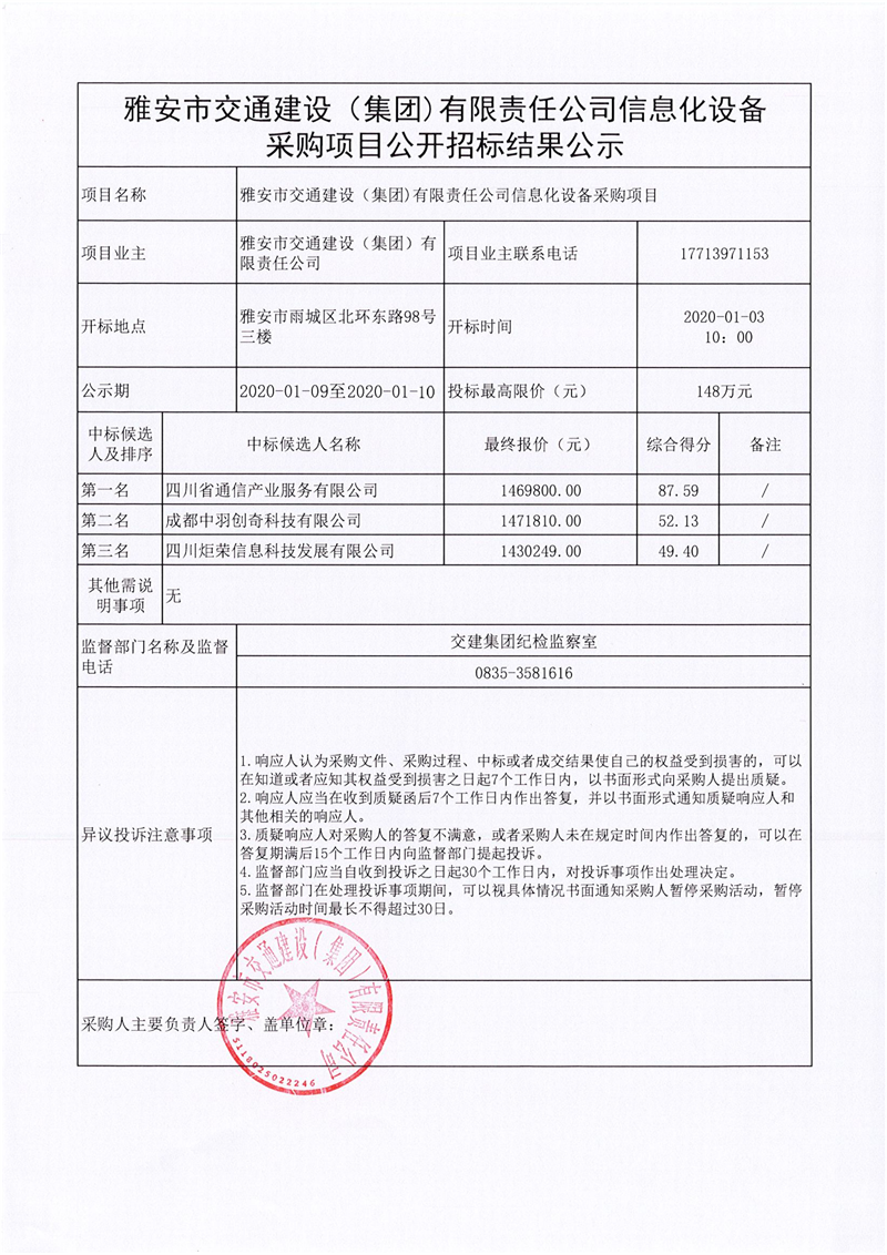 雅安市交通建設(shè)(集團(tuán))有限責(zé)任公司信息化設(shè)備采購(gòu)項(xiàng)目公開招標(biāo)結(jié)果公示