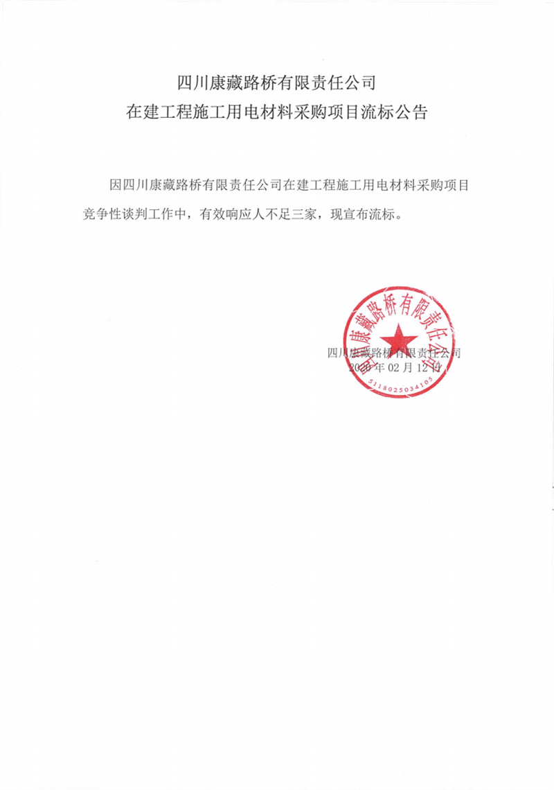 四川康藏路橋有限責(zé)任公司在建工程施工用電材料采購項目流標(biāo)公告