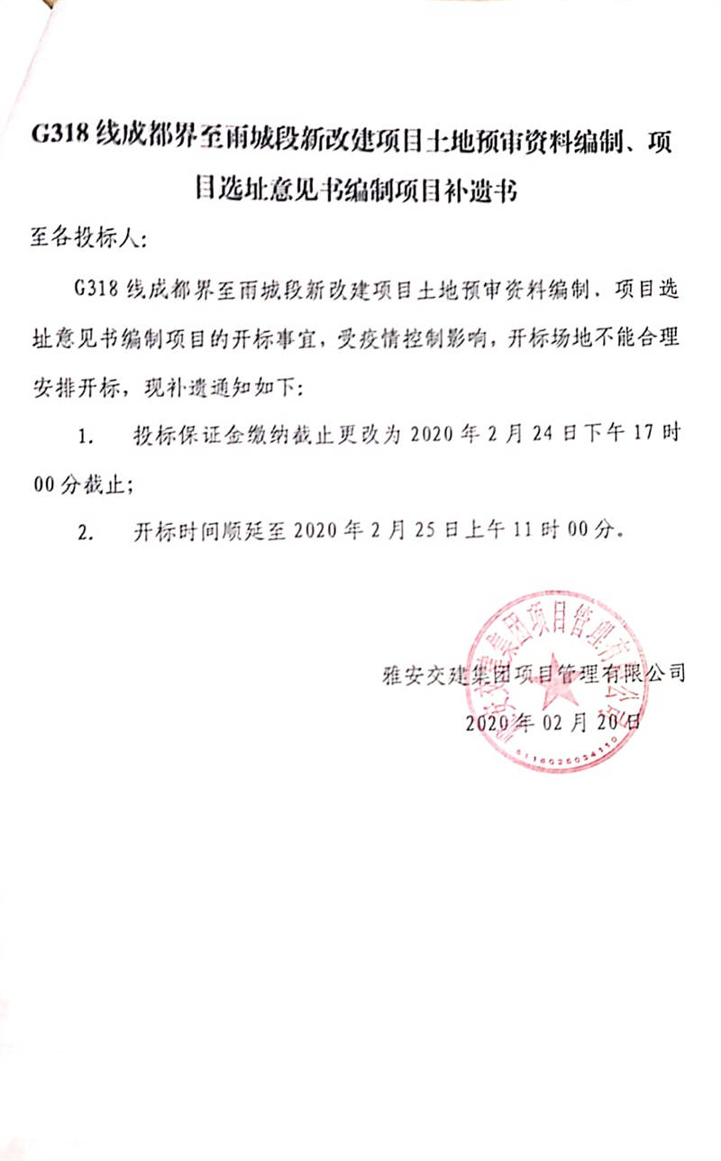 雅安交建集團(tuán)項(xiàng)目管理有限公司G318線成都界至雨城段新改建項(xiàng)目土地預(yù)審資料編制、項(xiàng)目選址意見(jiàn)書編制項(xiàng)目補(bǔ)遺書