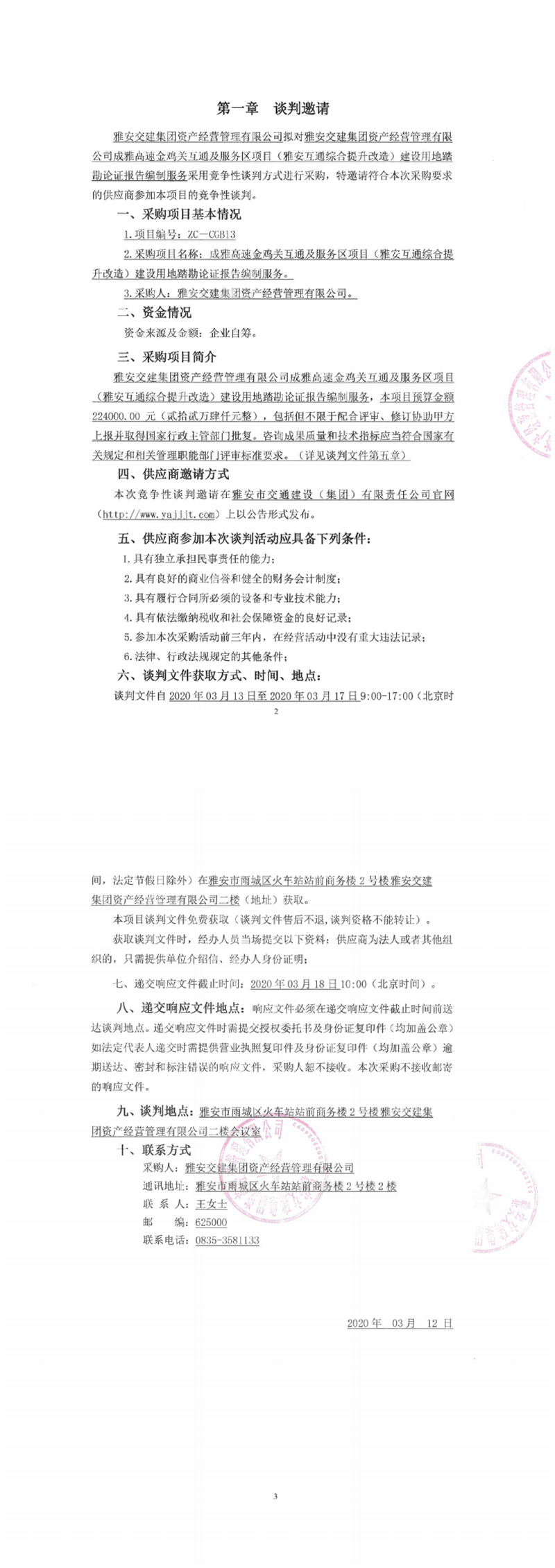 雅安交建集團資產(chǎn)經(jīng)營管理有限公司成雅高速金雞關(guān)互通及服務(wù)區(qū)項目(雅安互通綜合提升改造)建設(shè)用地踏勘論證報告編制服務(wù)競爭性談判公告