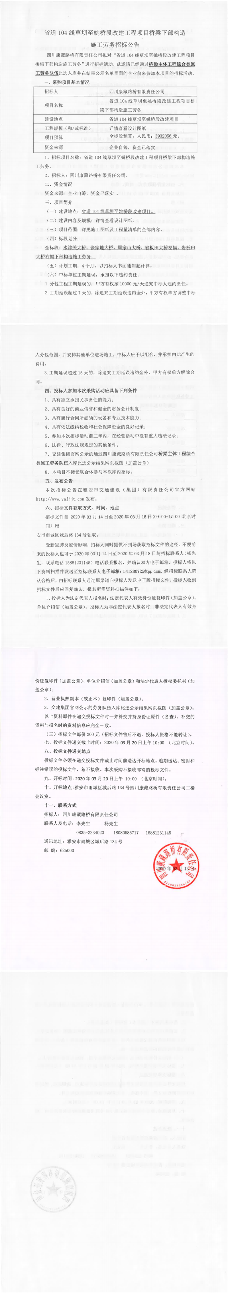 四川康藏路橋有限責任公司省道104線草壩至姚橋段改建工程項目橋梁下部構(gòu)造施工勞務(wù)招標公告