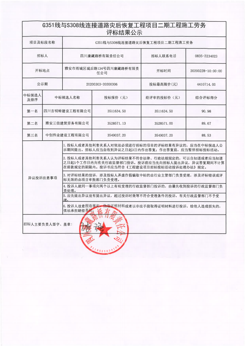四川康藏路橋有限責(zé)任公司G351線與S308線連接道路災(zāi)后恢復(fù)工程項目二期工程施工勞務(wù)評標(biāo)結(jié)果公示