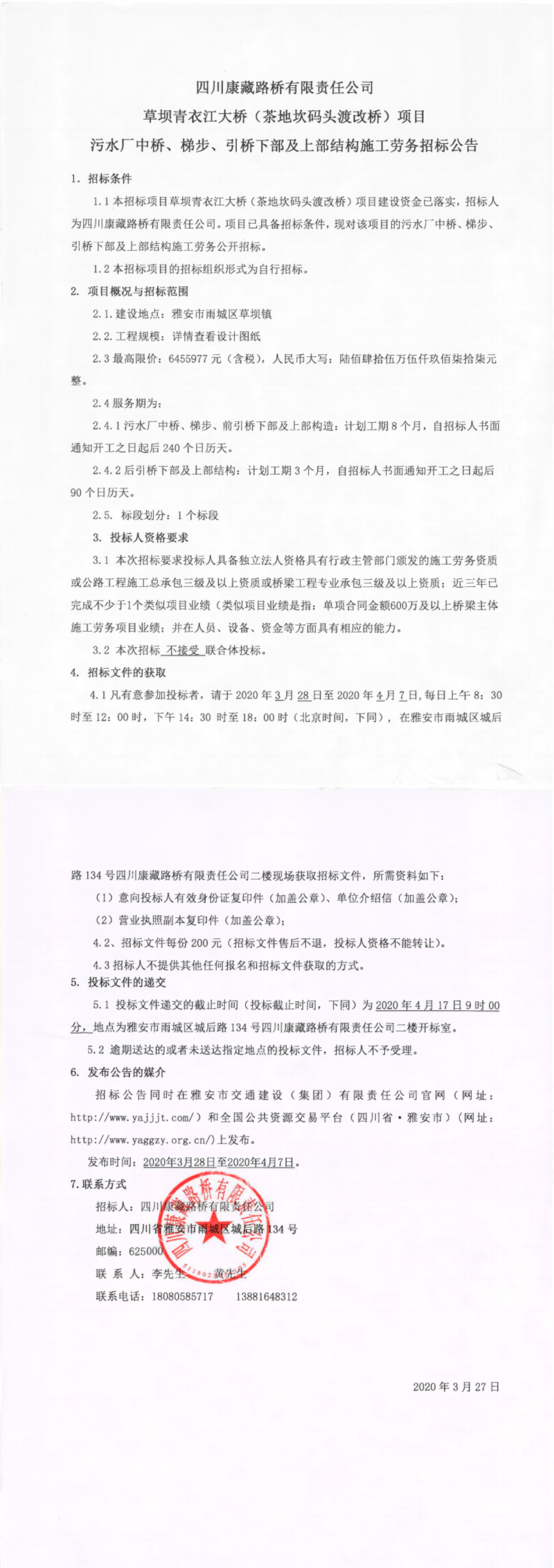 四川康藏路橋有限責任公司草壩青衣江大橋(茶地坎碼頭渡改橋)項目污水廠中橋、梯步、引橋下部及上部結(jié)構(gòu)施工勞務(wù)招標公告