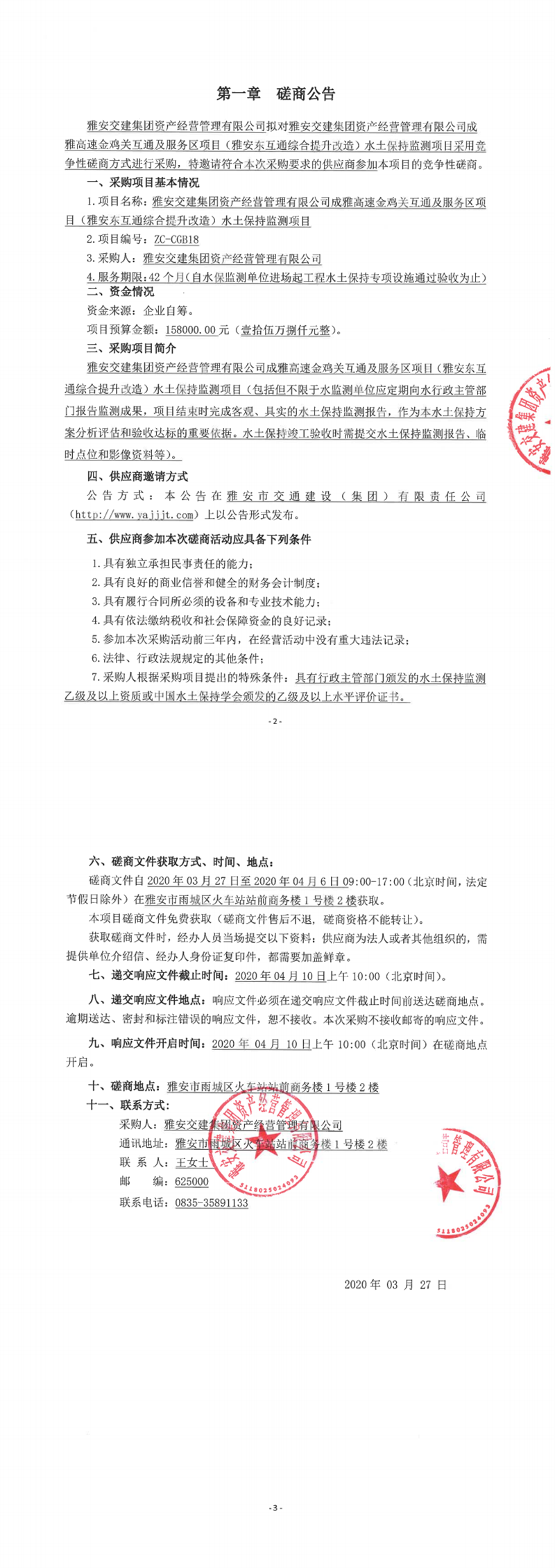 雅安交建集團資產(chǎn)經(jīng)營管理有限公司成雅高速金雞關(guān)互通及服務(wù)區(qū)項目(雅安東互通綜合提升改造)水土保持監(jiān)測項目競爭性磋商公告