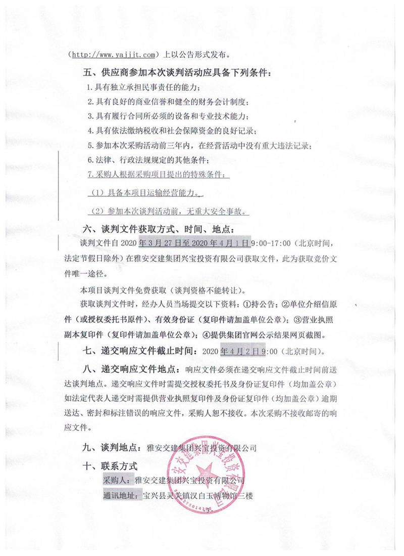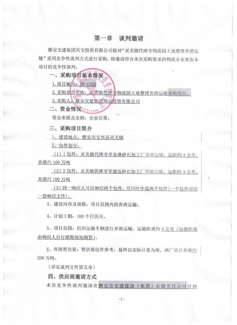 雅安交建集團(tuán)興寶投資有限公司靈關(guān)鎮(zhèn)代碑寺物流園土地整理?xiàng)壴\(yùn)輸采購項(xiàng)目競(jìng)爭(zhēng)性談判公告