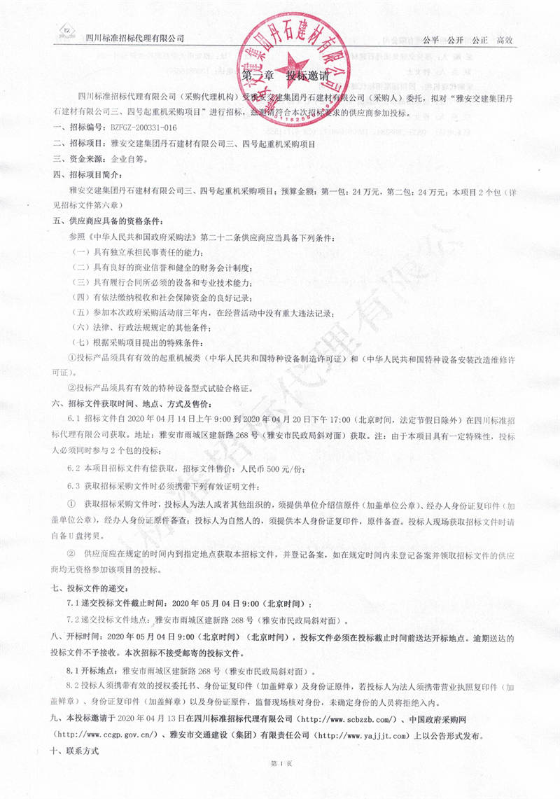 雅安交建集團(tuán)丹石建材有限公司三、四號(hào)起重機(jī)采購項(xiàng)目招標(biāo)公告