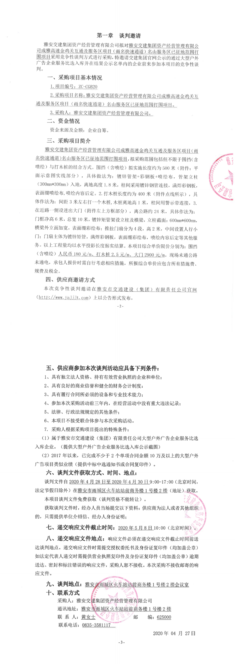 雅安交建集團資產經營管理有限公司成雅高速金雞關互通及服務區(qū)項目(雨名快速通道)名山服務區(qū)已征地范圍打圍項目競爭性談判公告