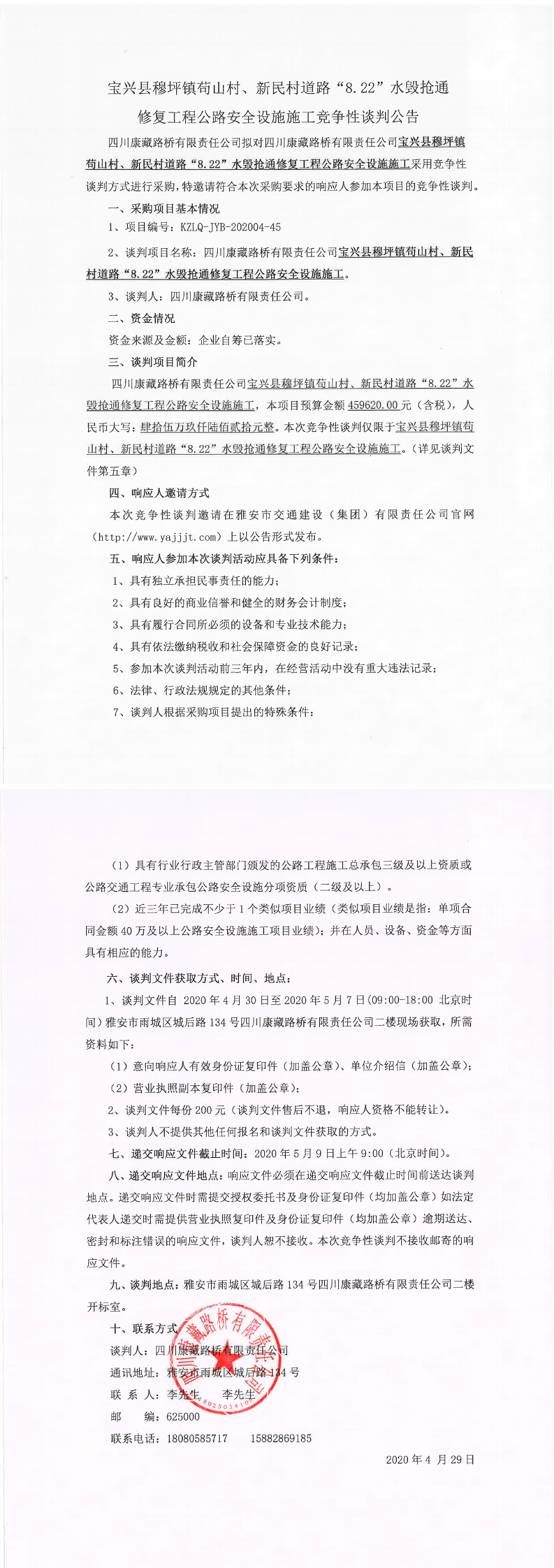 四川康藏路橋有限責(zé)任公司寶興縣穆坪鎮(zhèn)茍山村、新民村道路“8.22”水毀搶通修復(fù)工程公路安全設(shè)施施工競爭性談判公告