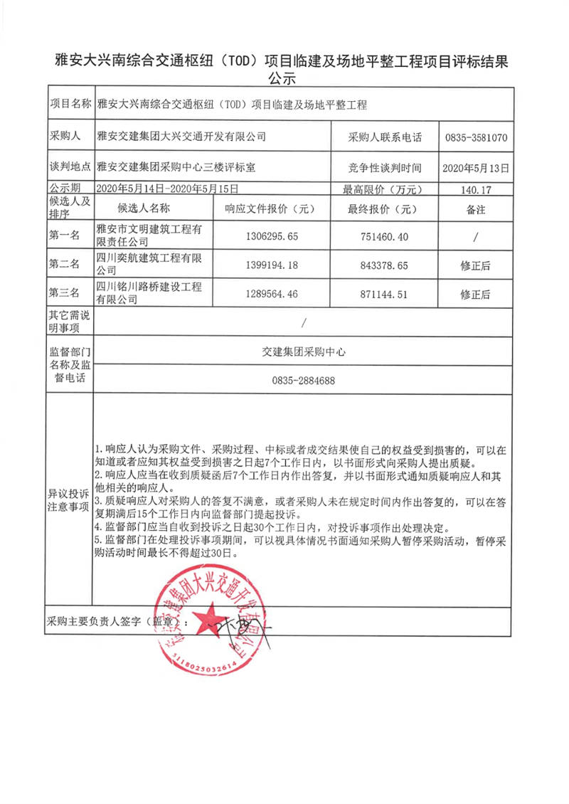 雅安交建集團(tuán)大興交通開發(fā)有限公司雅安大興南綜合交通樞紐(TOD)項(xiàng)目臨建及場地平整工程項(xiàng)目評(píng)標(biāo)結(jié)果公示