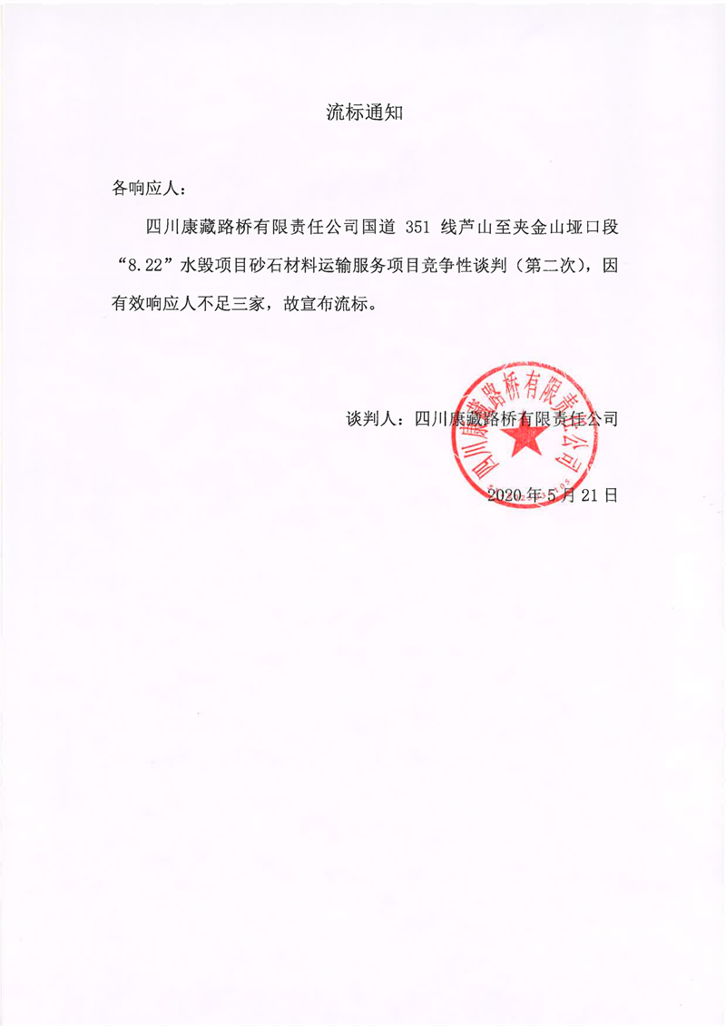 四川康藏路橋有限責(zé)任公司國(guó)道351線蘆山至夾金山埡口段8.22水毀項(xiàng)目砂石材料運(yùn)輸服務(wù)項(xiàng)目(第二次)流標(biāo)通知