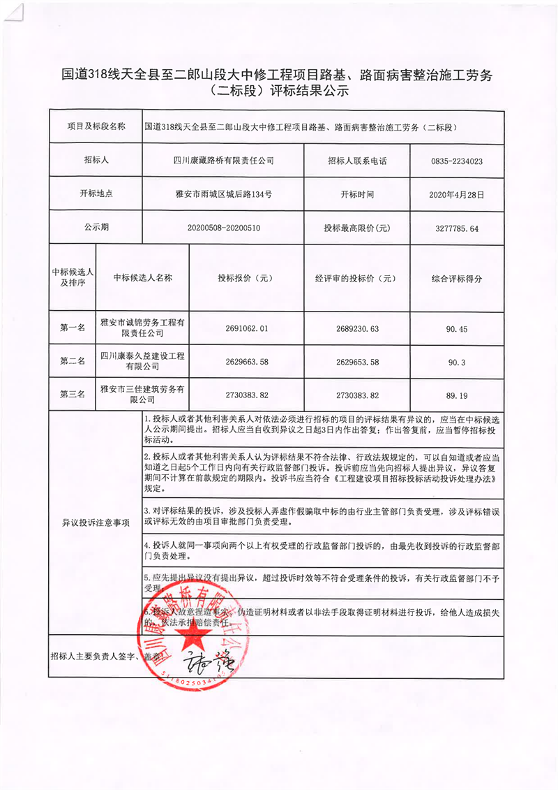 四川康藏路橋有限責(zé)任公司國道318線天全縣至二郎山段大中修工程項(xiàng)目路基、路面病害整治施工勞務(wù)(二標(biāo)段)評標(biāo)結(jié)果公示