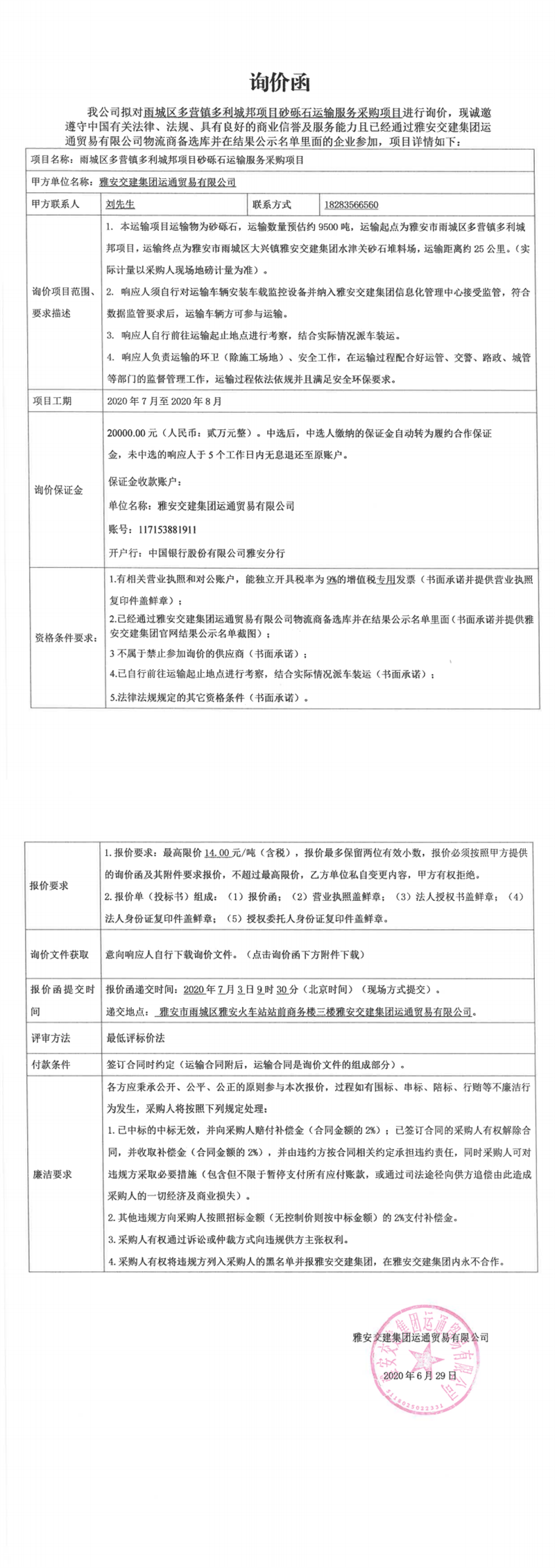 雅安交建集團(tuán)運通貿(mào)易有限公司雨城區(qū)多營鎮(zhèn)多利城邦項目砂礫石運輸服務(wù)采購項目詢價函