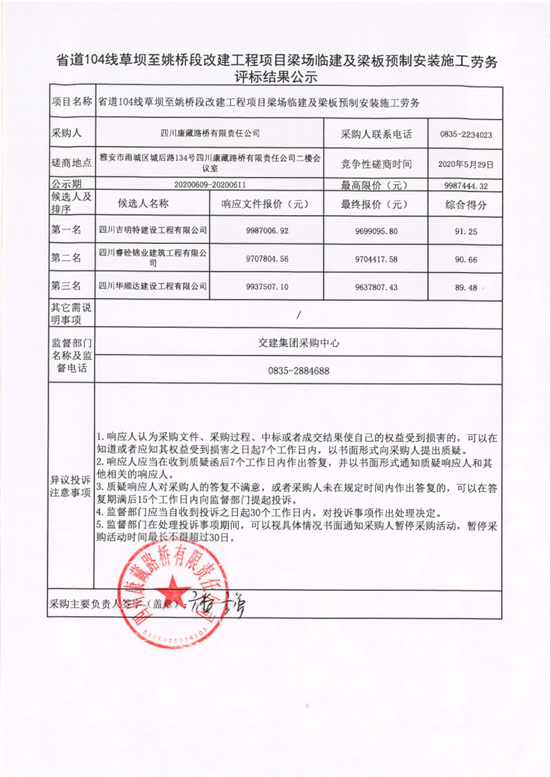 四川康藏路橋有限責任公司省道104線草壩至姚橋段改建工程項目梁場臨建及梁板預制安裝施工勞務評標結果公示
