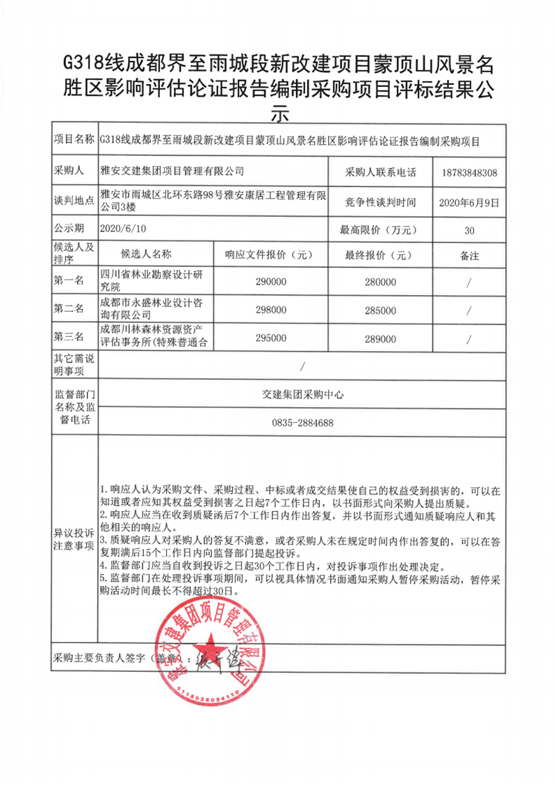 雅安交建集團項目管理有限公司G318線成都界至雨城段新改建項目蒙頂山風景名勝區(qū)影響評估論證報告編制采購項目評標結果公示
